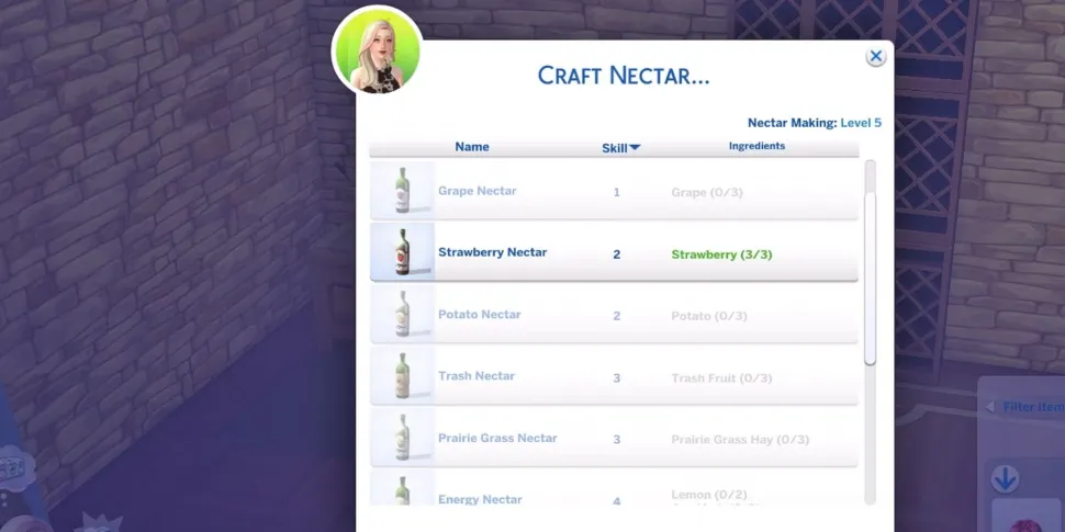На самом деле это самый сложный этап процесса, просто из-за количества бутылок, которые необходимо изготовить, и множества факторов, которые играют роль в качестве нектара. Три фактора, которые играют наибольшую роль в качестве нектара, - это качество ингредиентов, уровень мастерства и настроение сима. Так, игроки, использующие идеальные ингредиенты, могут приготовить отличный нектар, даже если у них низкий уровень мастерства, в то время как игроки, использующие базовые ингредиенты, могут приготовить отличные бутылки, имея более высокий уровень мастерства. И наоборот, при использовании высококачественных ингредиентов и высоком уровне мастерства, если сим находится в негативном настроении, например грустит, бутылка все равно может получиться некачественной.