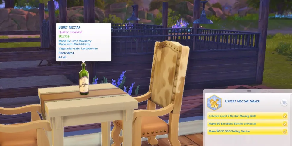 Кроме того, игроки могут сократить этот процесс, увеличив единичную ценность каждого изготовленного нектара, вместо того чтобы ждать, пока почти весь их превосходный нектар достигнет состояния тонкой выдержки. Для этого игрокам следует сосредоточиться на производстве нектара, который ранее был закрыт за более высоким уровнем изготовления нектара, например, фруктового нектара и ягодного нектара. Кроме того, наличие навыка "Товарная награда" также способствует повышению стоимости нектаров. Наконец, игроки могут подумать о том, чтобы продать нектар недавно созданному симу Роберто Кринклтопу, который купит нектар по более высокой цене. Этого сима можно найти в Каштановом хребте. Если объединить все эти аспекты, то один превосходный нектар тонкой выдержки можно продать более чем за 10 тыс. симолеонов и создать отличный пассивный доход для сима. Стоит отметить, что хотя признак "Ранчер" не помогает в подсчете бутылок с отличным нектаром, он помогает создать больше нектара за более короткое время, что, соответственно, увеличивает количество симолеонов, которые можно заработать.