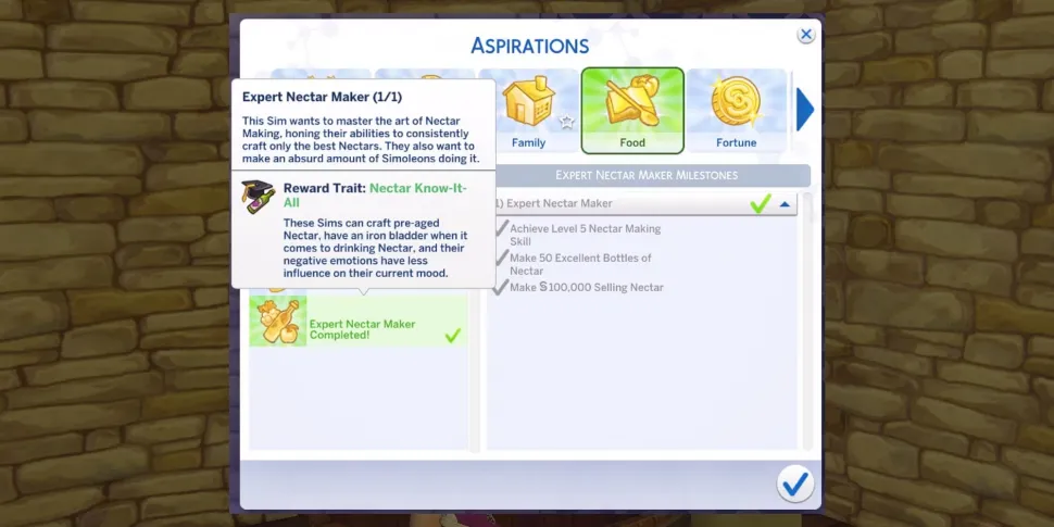 Выполнив это стремление, симы получат в награду черту "Знаток нектара". Эта черта полезна для любого сима, независимо от того, является ли он в первую очередь любителем нектара, продавцом или ни тем, ни другим. Это связано с тем, что он дает дополнительный толчок к выдержке нектара, что позволяет быстрее повысить его продажную стоимость, а также больше насладиться нектаром тем, кто его пьет. Интересно, что нектар будет меньше влиять на потребность сима в мочевом пузыре, что может быть не так полезно для симов, у которых уже есть награда "Стальной мочевой пузырь".