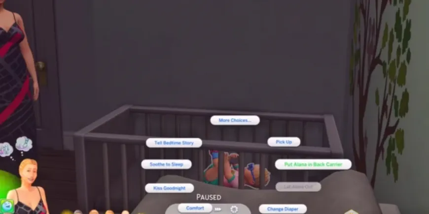 Игроки могут брать своих детей с собой в переноске, взаимодействуя с младенцем, управляя взрослым симом, выбирая опцию "Уход за малышом", а затем выбирая "Положить [имя сима] в переноску".