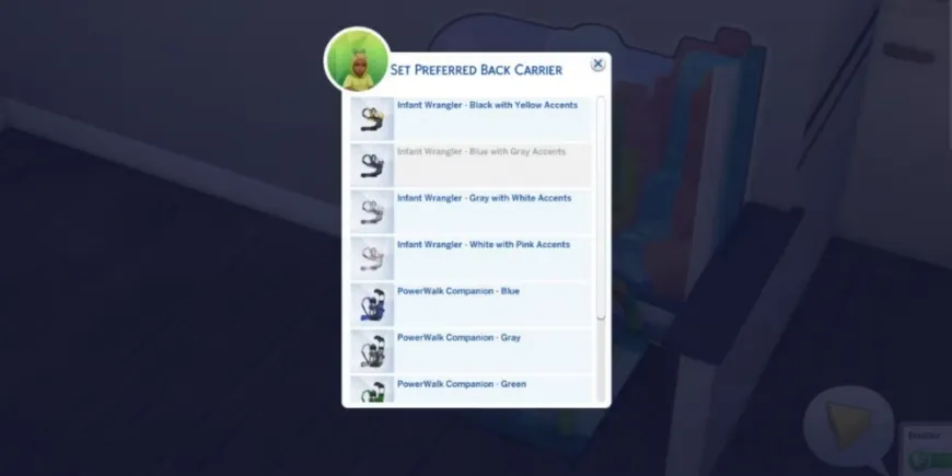 Чтобы сменить переноску для младенца во время прогулки, игрок должен выбрать младенца, войти в меню "Уход за малышами" и выбрать опцию "Выбрать предпочтительную переноску для спины".