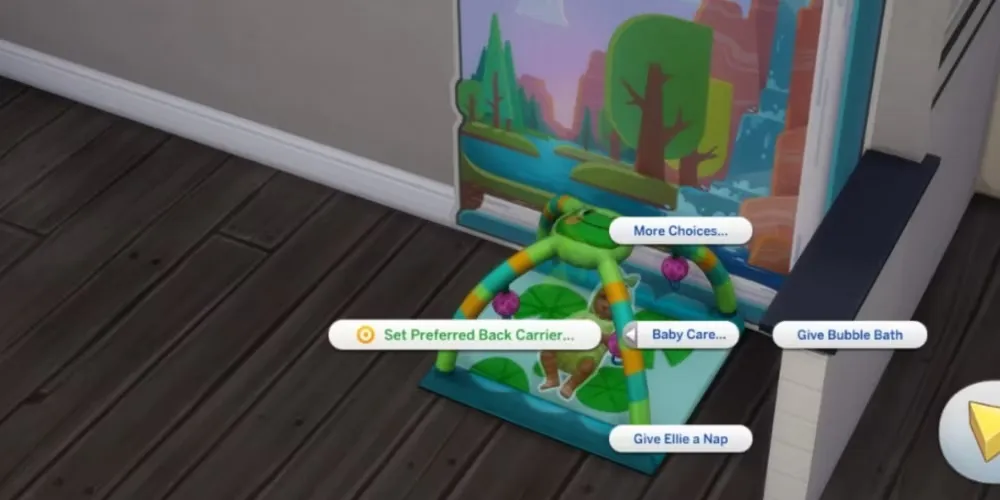 Чтобы сменить переноску для младенца во время прогулки, игрок должен выбрать младенца, войти в меню "Уход за малышами" и выбрать опцию "Выбрать предпочтительную переноску для спины".