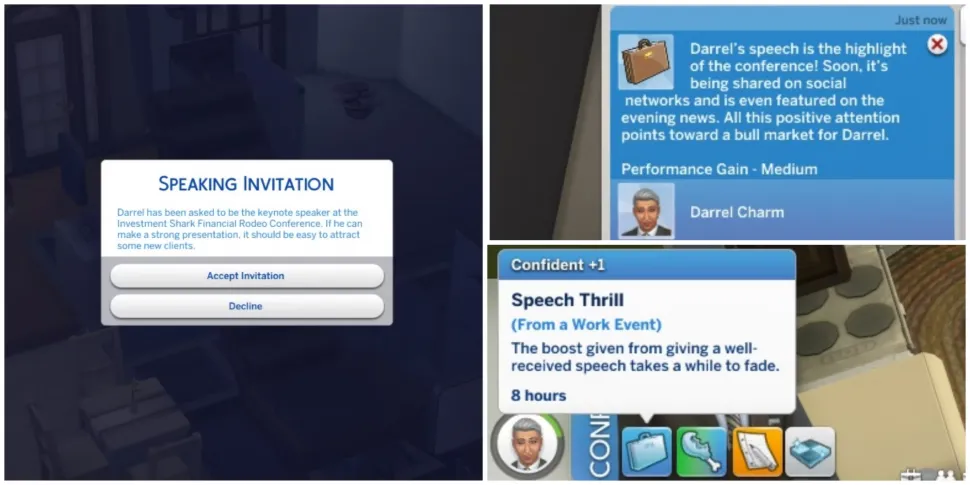 Время от времени на работе могут происходить странные ситуации, и на экране будут появляться повествовательные эпизоды, заставляющие игрока выбирать, как его симу следует реагировать на тот или иной инцидент. К сожалению, здесь нет правильного или неправильного ответа; независимо от того, что игрок считает лучшим выбором, он может пойти в любую сторону, поскольку исход случайный. В конце концов, сим либо потеряет, либо получит производительность.