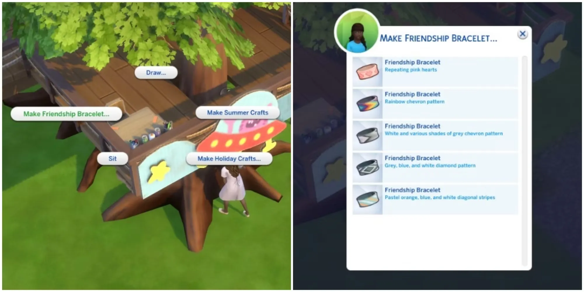 Чтобы сделать браслет дружбы, просто взаимодействуйте со столом активности и выберите опцию "Сделать браслет дружбы". После этого откроется меню, и игроку нужно будет выбрать, какой браслет он хотел бы сделать и подарить близкому члену семьи. Это может сделать любой сим, если он ребенок или старше. Варианты браслетов дружбы следующие: