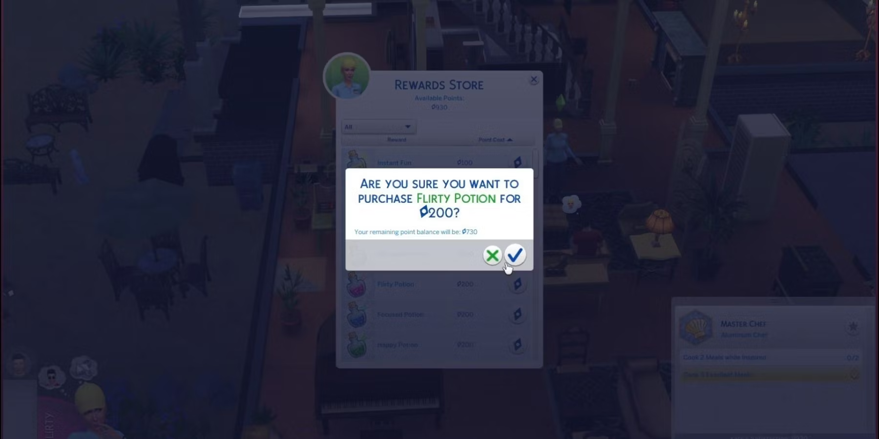Игроки также могут заставить своих симов выпить приворотное зелье, чтобы придать им кокетливости. Это зелье можно приобрести за 200 очков удовлетворения в Магазине вознаграждений.