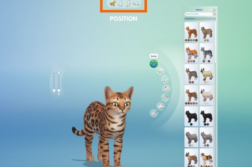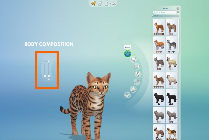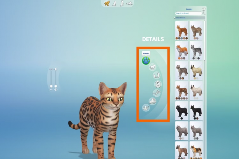 Начать редактировать внешность кошки лучше всего с панели "Породы", которую можно найти, выбрав символ в виде лапы в правом меню деталей. В пакете расширения The Sims 4: Cats and Dogs представлено 48 пород кошек, а также одна особая порода - енот.