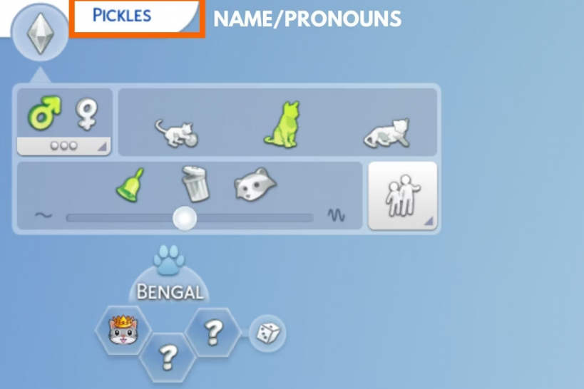 Вы также можете изменить местоимения вашего питомца. Щелкните по выпадающему меню справа от имени кошки, чтобы выбрать местоимения, которые, по вашему мнению, подходят ей больше всего.