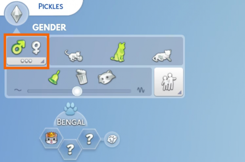 Измените пол вашей кошки, щелкнув по одному из значков пола. Если вы не знакомы с этими символами, наведите курсор на каждый из них, чтобы появилась надпись. Под ним вы увидите значок с тремя точками. Щелкните по этому значку, чтобы определить, сможет ли ваша кошка размножаться.