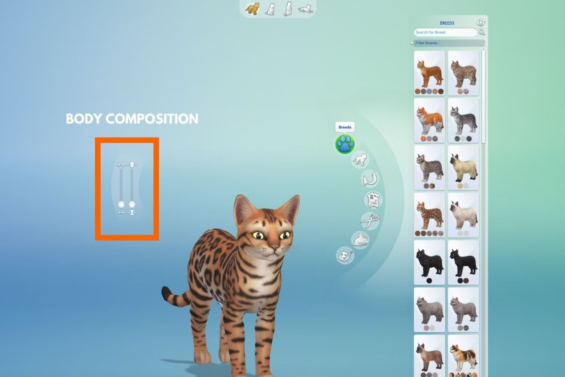 Начать редактировать внешность кошки лучше всего с панели "Породы", которую можно найти, выбрав символ в виде лапы в правом меню деталей. В пакете расширения The Sims 4: Cats and Dogs представлено 48 пород кошек, а также одна особая порода - енот.
