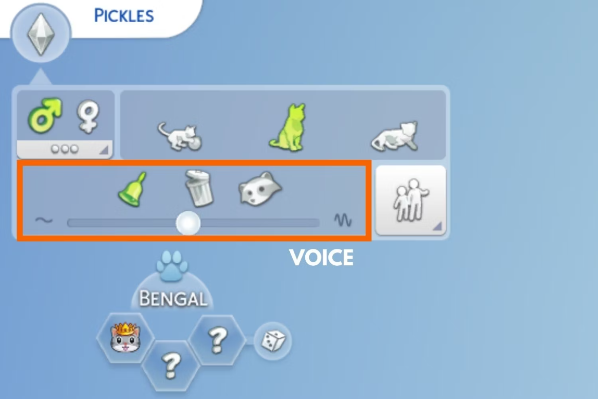 В The Sims 4 вы можете выбрать один из трех типов голоса: Ясный, Царапающийся или Енот (да, Енот). Затем с помощью ползунка измените высоту голоса вашей кошки.