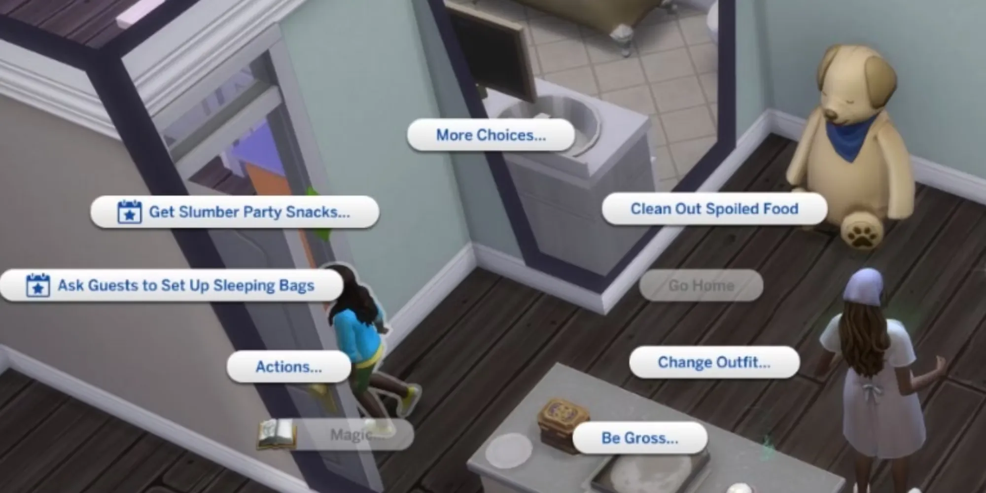Существуют различные стандартные второстепенные задания, которые Сим может выполнить, чтобы повысить эффективность своего события, например, танцевать, играть в игры и есть одновременно. Наличие стереосистемы и игрового или шахматного стола - отличная идея для вечеринки Slumber Party и любого другого социального мероприятия The Sims 4.