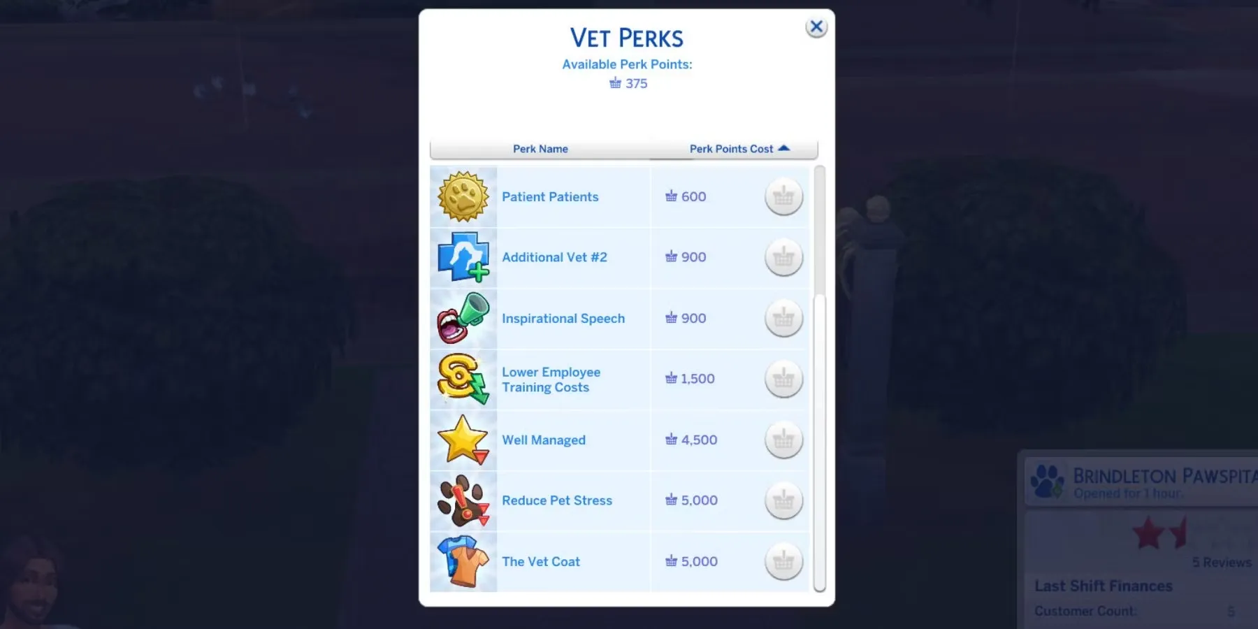 По мере роста навыка ветеринара симы, владеющие ветеринарными клиниками, зарабатывают очки перков, которые можно потратить на слоты для сотрудников, черты клиентов и другие полезные вещи для клиники.