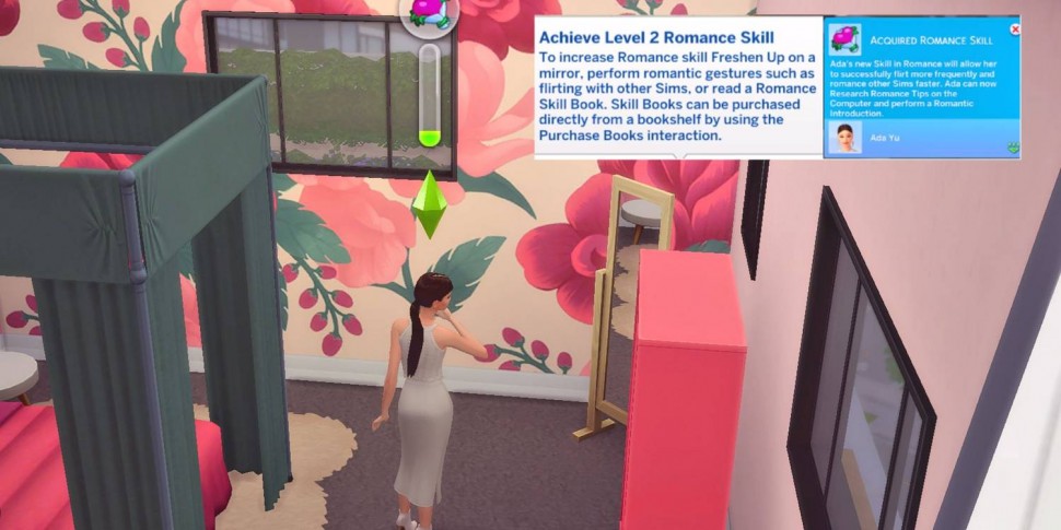 Введенный навык «Романтика» разработан так, чтобы его было относительно легко развивать, не уделяя ему особого внимания, поскольку он предоставляет игрокам множество способов повысить романтическую доблесть своих симов. Чтобы продвинуться в этом навыке, симам нужно просто вступать в романтические или флиртующие отношения с другими людьми или участвовать в таких мероприятиях, как «Прихорошиться в зеркале». Кроме того, игроки могут ускорить свой прогресс, изучая новый набор книг навыков, посвященных романтике.