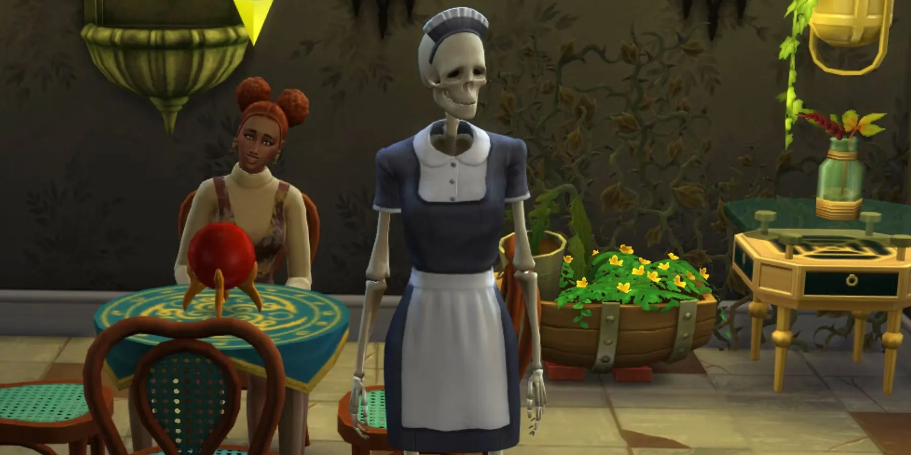 Пакет The Sims 4: Paranormal Stuff вернул классического персонажа The Sims по имени Бонехильда. Бонехильда - это скелетная горничная с кокетливым характером, которую можно вызвать, чтобы помочь с делами по дому или даже составить компанию. В прошлом игроки могли приобрести специальный гроб, в который помещалась Бонехильда на их участке, но в The Sims 4 она доступна только через более временные методы.