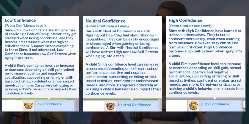 Как только малыш перерастет в ребенка или новый сим-ребенок будет создан в CAS, может пройти несколько часов, прежде чем появится счетчик уверенности. Симы-дети обычно начинают с нейтральным уровнем уверенности, хотя, возможно, они уже начали обретать уверенность, будучи младенцами или малышами. По мере роста их уверенность может либо повышаться, либо понижаться, в зависимости от действий, которые они совершают. Хотя уровень уверенности в себе устанавливается только к подростковому возрасту, они все равно будут испытывать определенные настроения, основанные на их текущем уровне уверенности в себе в детстве. Важно отметить, что счетчик уверенности отличается от значений персонажа, введенных в The Sims 4 Parenthood Expansion Pack. Ценности персонажей появляются только после того, как симы становятся взрослыми, и только тогда они получают черты характера и взаимодействия, основанные на их ценностях. Всего существует 3 уровня уверенности