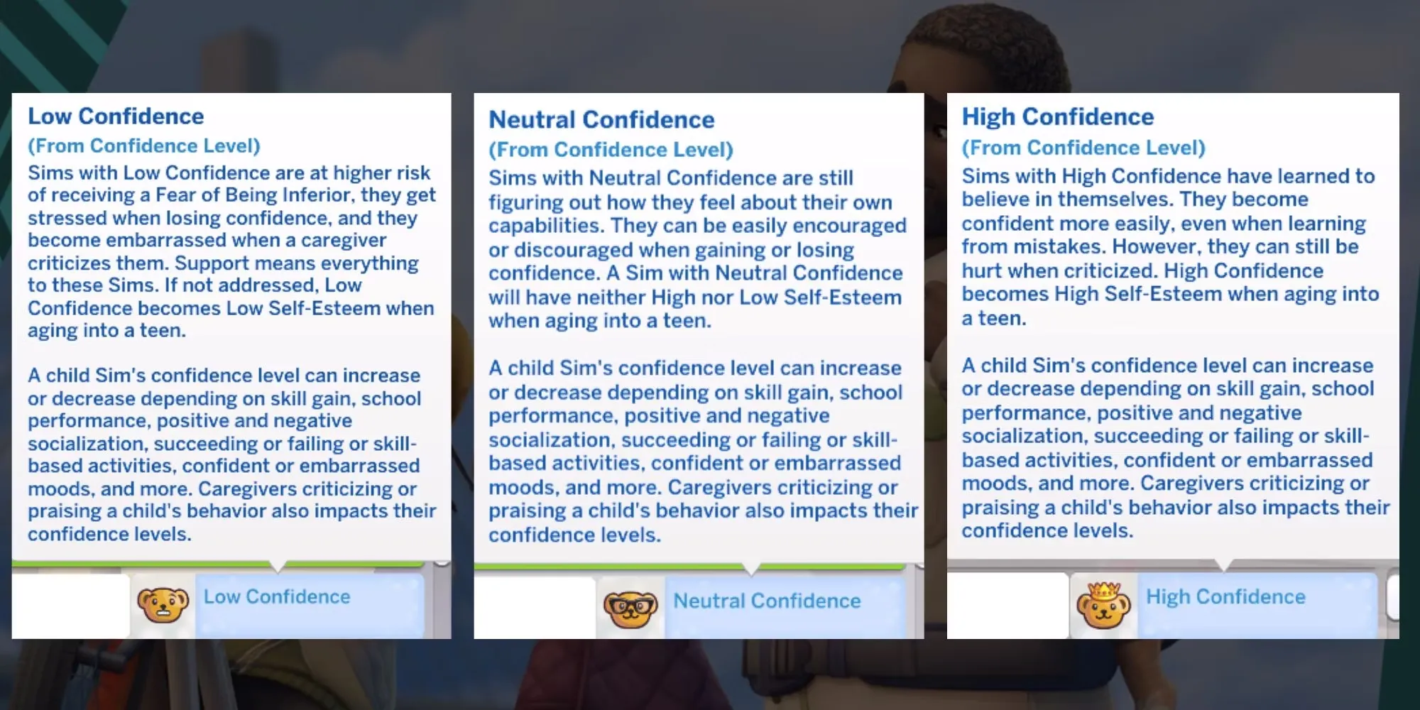 Как только малыш перерастет в ребенка или новый сим-ребенок будет создан в CAS, может пройти несколько часов, прежде чем появится счетчик уверенности. Симы-дети обычно начинают с нейтральным уровнем уверенности, хотя, возможно, они уже начали обретать уверенность, будучи младенцами или малышами. По мере роста их уверенность может либо повышаться, либо понижаться, в зависимости от действий, которые они совершают. Хотя уровень уверенности в себе устанавливается только к подростковому возрасту, они все равно будут испытывать определенные настроения, основанные на их текущем уровне уверенности в себе в детстве. Важно отметить, что счетчик уверенности отличается от значений персонажа, введенных в The Sims 4 Parenthood Expansion Pack. Ценности персонажей появляются только после того, как симы становятся взрослыми, и только тогда они получают черты характера и взаимодействия, основанные на их ценностях. Всего существует 3 уровня уверенности
