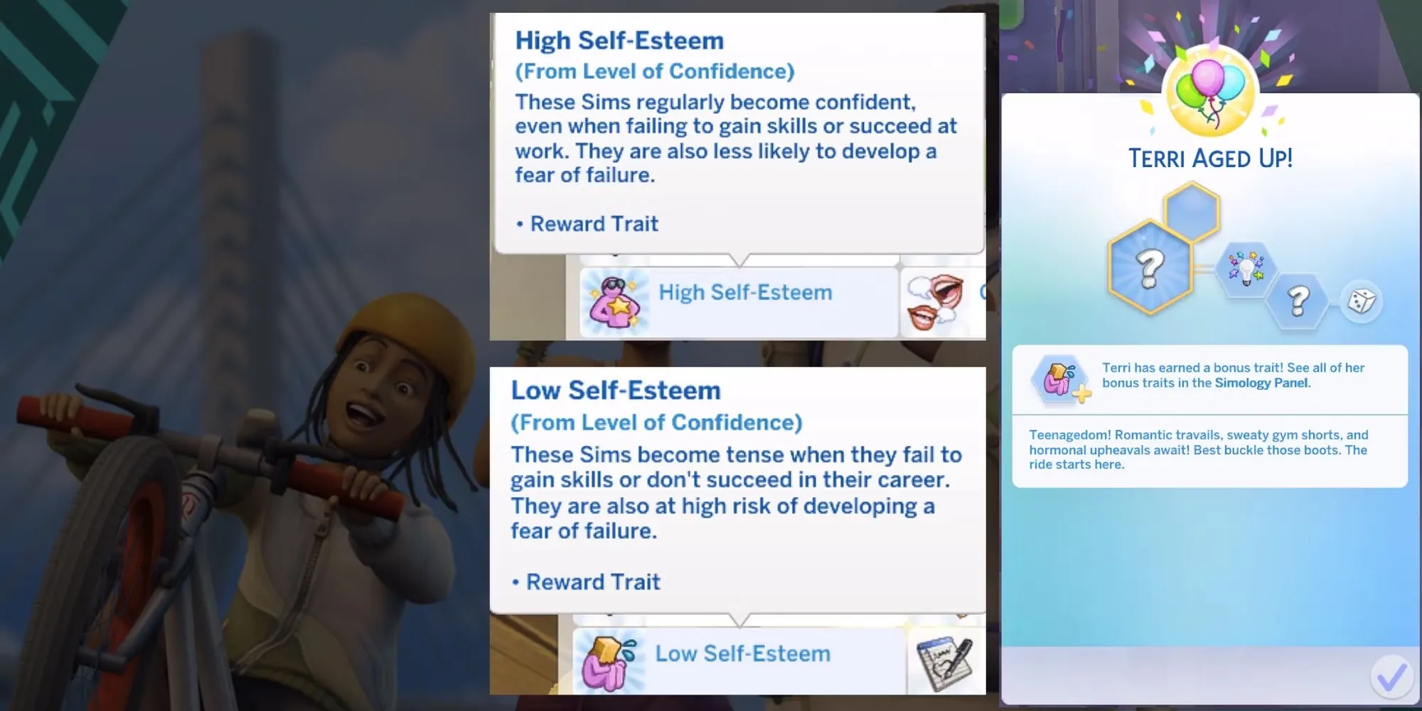 Когда ребенок достигнет подросткового возраста, он будет вознагражден определенными чертами, основанными на его уровне уверенности. Симы с высоким уровнем уверенности получат в награду черту, отражающую их позитивный взгляд на вещи, а симы с низким уровнем уверенности получат черту, отражающую их трудности. Однако если ребенок достигнет подросткового возраста с нейтральным уровнем уверенности, он не получит никаких новых черт.