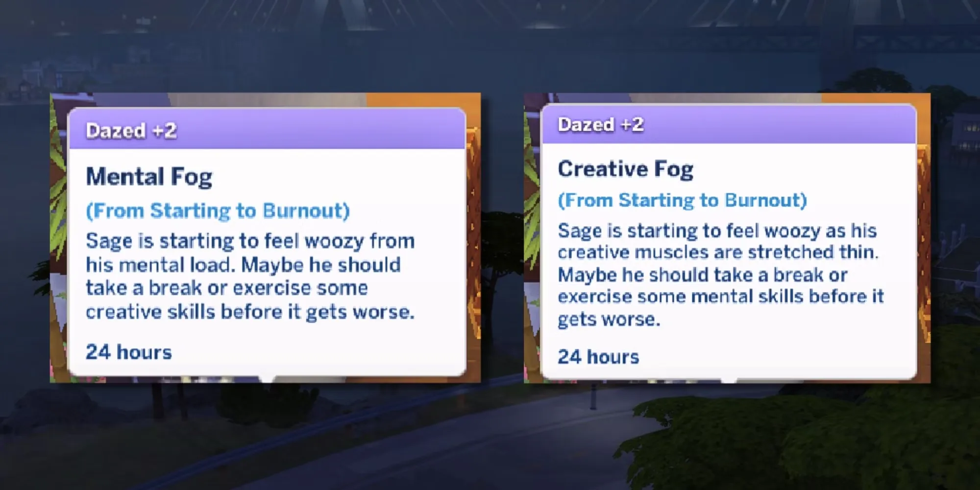 Выгорание может возникнуть при любой деятельности, например, при рисовании или чрезмерных физических нагрузках, и может негативно повлиять на настроение сима, если его заставляют продолжать работать или практиковать навык без перерыва. Прежде чем сим испытает выгорание, он получит один из двух настроений "Ошарашенность": "Ментальный блок" или "Творческий блок". Ментальный блок возникает, прежде всего, из-за слишком большого количества дней "Напряженной работы" в своей карьере без отпуска или из-за других занятий, например, чрезмерной игры в шахматы. Творческий блок, с другой стороны, возникает, прежде всего, от таких занятий, как рисование или писательство, которые многие "симеры" склонны выполнять в качестве внештатной работы для своих "симов" из-за возможности зарабатывать деньги. Если эти настроения сохраняются слишком долго, и симы не делают перерыв в соответствующей деятельности, они в конечном итоге вызывают настроение Выгорания.