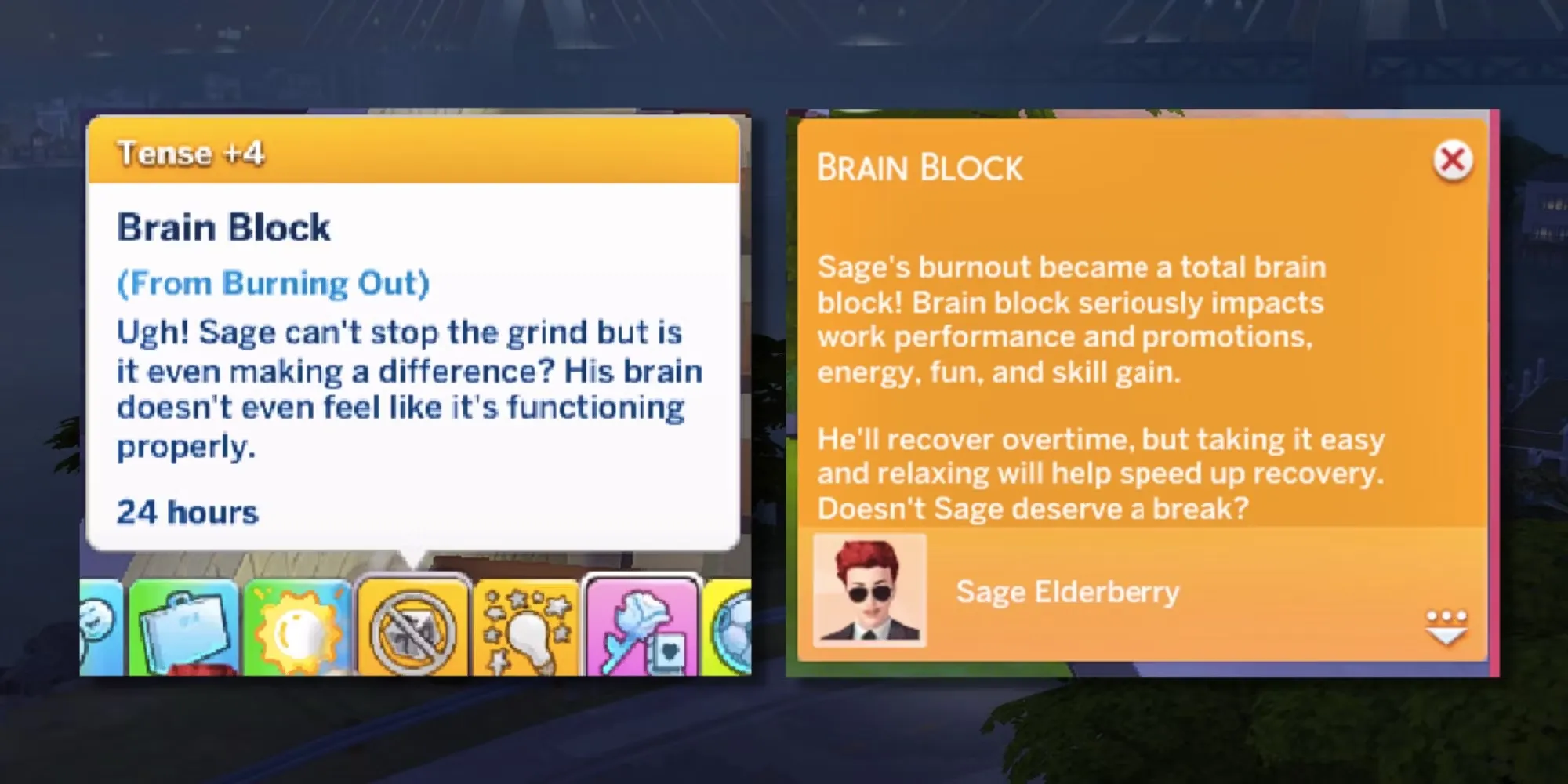 Как только у "сима" наступит состояние выгорания, игрокам необходимо предпринять действия, чтобы снять настроение "Напряжение" и ускорить таймер выгорания. Существуют различные действия, которые можно предпринять для снятия напряженного настроения, например, пробежка, отдых на пляже, медитация, прогулки в задумчивости и даже отпуск на работе. Продолжительность действия настроения "Выгорание" может быть уменьшена в зависимости от пакетов, которыми могут владеть игроки, и как только оно будет снято, все вернется на круги своя. Однако если игроки продолжают выполнять чрезмерные действия, например, много работать, продолжительность настроения увеличивается и в конце концов превращается в настроение "Блокировка мозга". Этот настрой действует так же, как и "Выгорание", но с более сильным настроем "Напряжение" +4, а также с повышенной сложностью в получении навыков, выполнении работы и более быстрым снижением потребности в веселье. Игроки могут уменьшить это состояние или подождать, пока оно пройдет само собой.