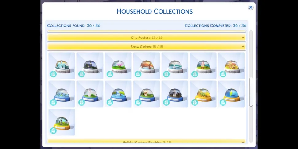 Коллекция шаров со снегом - еще один эксклюзив для пакета "Городская жизнь", и, как и в случае с коллекцией городских плакатов, игроки должны исследовать Сан-Мишуно, чтобы собрать их. Однако шары со снегом обычно находятся в коробках с выброшенным хламом, и симам придется порыться в них, чтобы найти их.