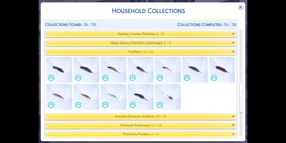 Коллекция перьев может быть получена только в расширении "Кошки и собаки" и требует помощи домашних животных. Хотя и кошки, и собаки могут собирать перья, кошки, как правило, более искусны в этом деле. Кроме того, домашние животные могут помочь и в сборе других коллекций.