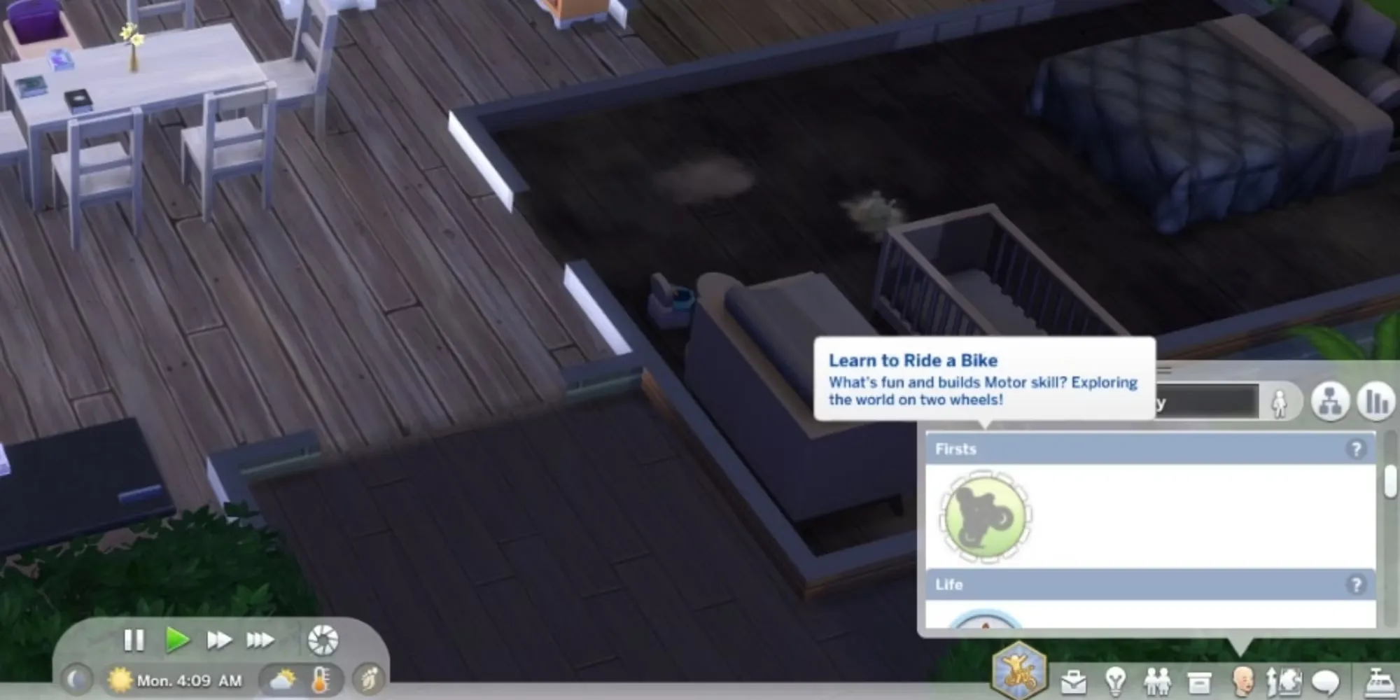 - Первые вехи (все этапы жизни): в этой категории рассказывается о первом опыте симов, когда дело доходит до важных жизненных событий, например, «Первый кошмар», «Первое купание», «Первое вуху».