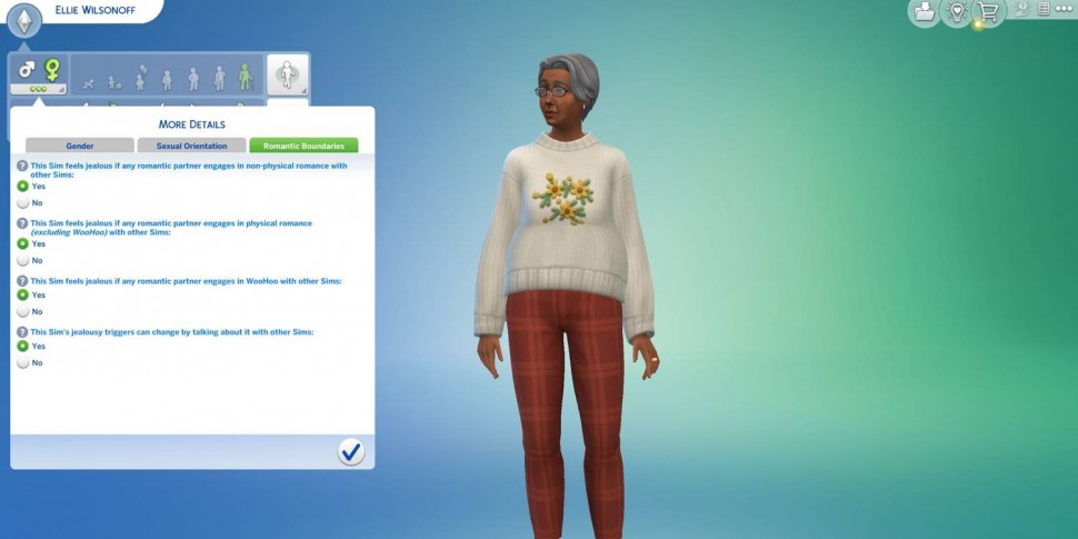 Панель «Личность» пополнилась новыми настройками в разделах «Пол» и «Сексуальная ориентация». Теперь игроки могут указать, как их симы реагируют на различные формы романтического взаимодействия. Сюда входят настройки ревности к нефизическим романтическим отношениям (таким как флирт или комплименты) или физическим романтическим отношениям (таким как поцелуи или Woohoo). Кроме того, появились новые опции, позволяющие настроить снисходительность ревности сима. Эта функция особенно полезна для игроков, использующих полную автономию, так как она может предотвратить непреднамеренный флирт со стороны других симов, чтобы не нарушить романтические отношения. Более того, недавнее исправление ошибки гарантирует, что симы, состоящие в отношениях, больше не будут получать автономный флирт от других симов, что дает игрокам больше контроля над романтической жизнью своих симов.