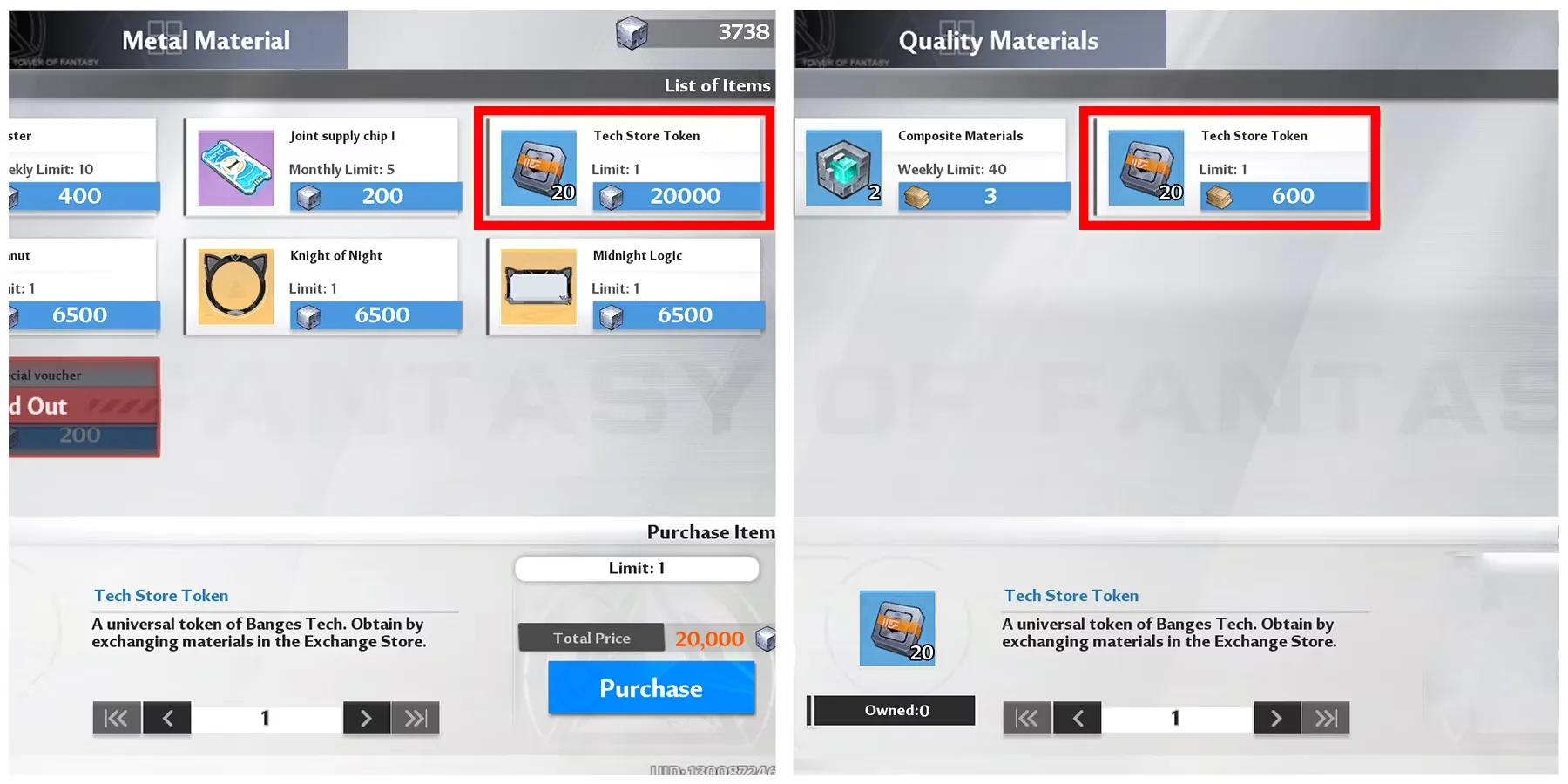 Жетон Tech Store - это валюта Tower of Fantasy, используемая в Exchange Store для покупки редких предметов. Чтобы получить первые 100 жетонов Tech Store, странникам нужно обменять 20 000 металлических материалов, волокнистых материалов, энергетических материалов, материалов снабжения и материалов аксессуаров в магазине обмена.