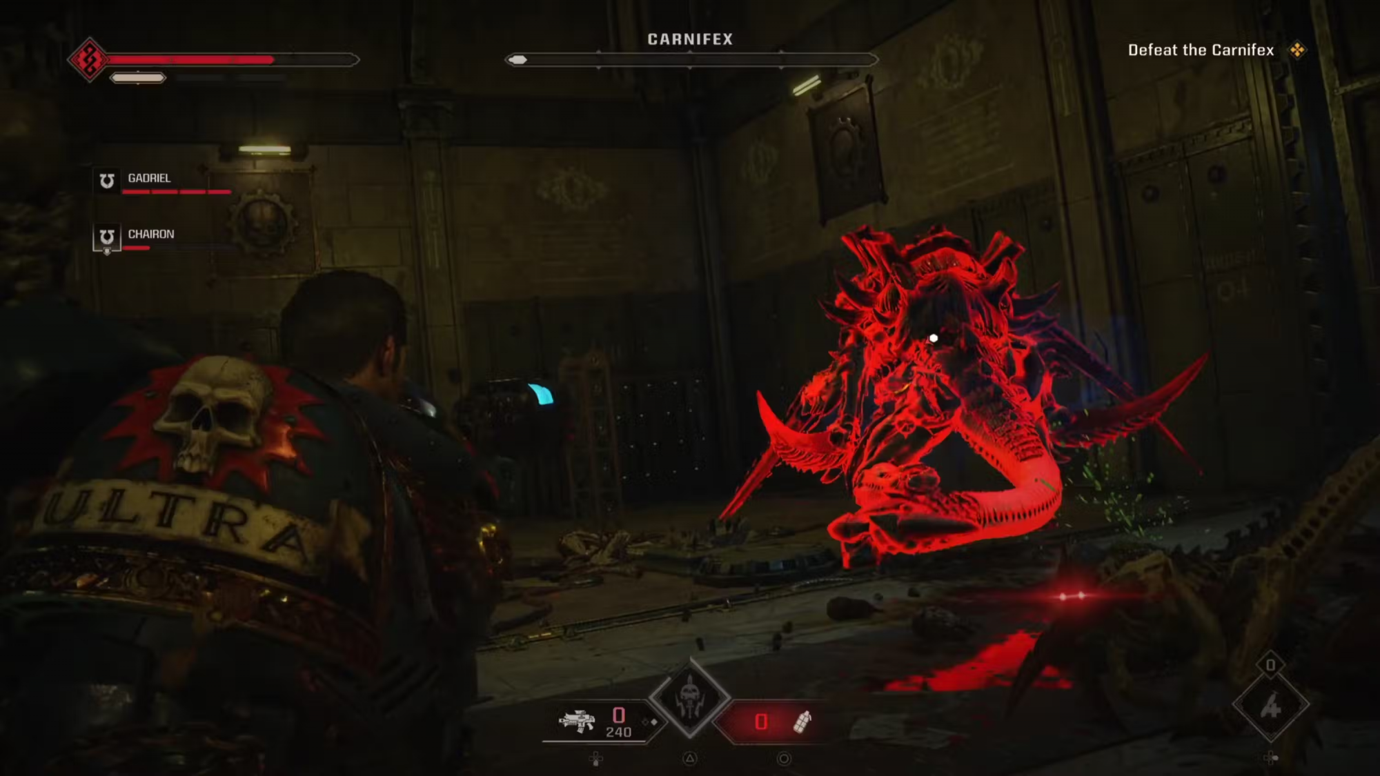 Это позволит вам медленно уменьшать его здоровье, а когда он будет отвлекаться на товарищей по команде, бросать гранаты ему под ноги, чтобы нанести еще больше урона. В конце концов это привлечет внимание монстра, так что приготовьтесь несколько раз уклониться от его неблокируемых атак. И даже если кажется, что подходить близко для атак в ближнем бою безопасно, не попадайтесь в эту ловушку, так как карнифекс либо обойдет его, либо вызовет ударную волну, которая может сбить вас с ног. Лучше всего оставаться на расстоянии и собирать дополнительные патроны и гранаты по всей арене.