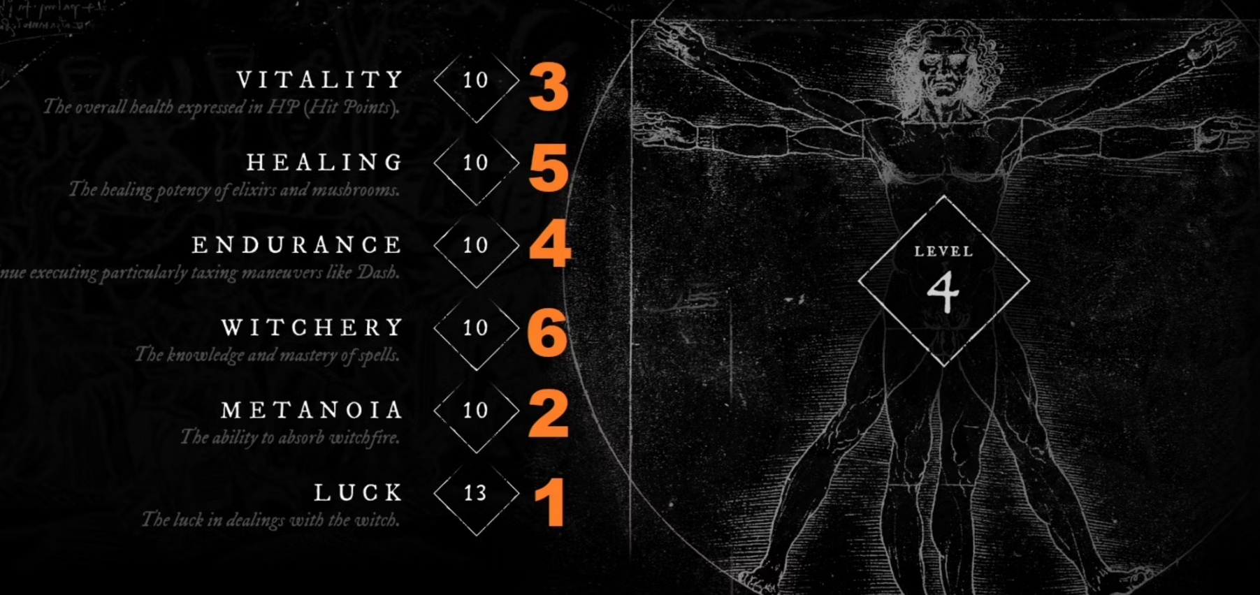В Witchfire игроку предоставляется большая свобода выбора заклинаний, оружия и даже характеристик. В храме Вознесения игрокам регулярно предоставляется возможность выбрать значимый атрибут и повысить его. Между Жизнеспособностью, Исцелением, Выносливостью, Колдовством, Метанойей и Удачей есть несколько вариантов, которые сделают будущие экспедиции более эффективными.