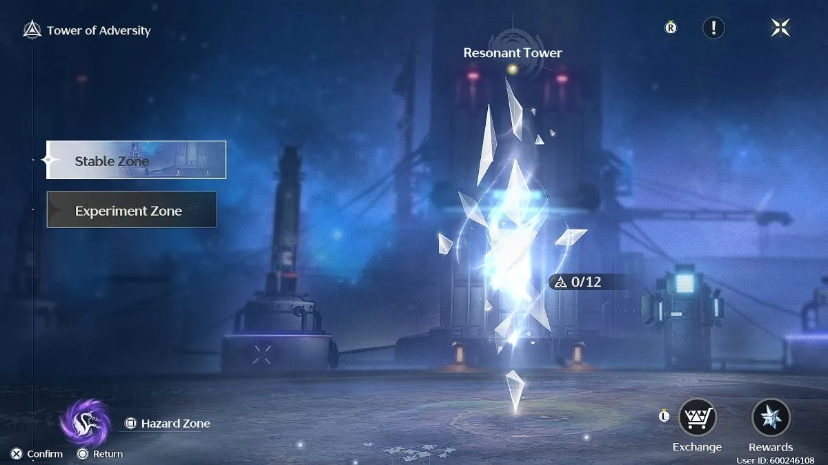 Взаимодействуйте с желтой дверью и выберите пункт Войти в Башню Невзгод. Выберите Стабильная зона и нажмите на голубой кристалл с надписью «0/12». Знак «0 из 12» означает, что в данный момент у вас ноль из двенадцати Гребней. Каждый раз, когда вы выполняете задание из Стабильной зоны: Резонансная башня в Wuthering Waves, у вас есть шанс получить три Гребня из целей задания.