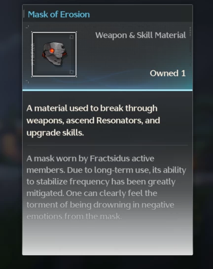Маска эрозии - материал средней редкости, поэтому Фраксидус не будет ее ронять, пока вы не достигнете более высокого уровня Банка данных и Союза. К сожалению, в путеводителе не указано требование к уровню. Вам придется продолжать копать до тех пор, пока они не начнут сбрасывать материал более высокой редкости, чем Маска ограничения.