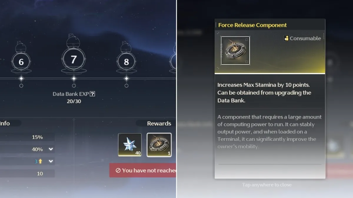 В игре Wuthering Waves вы можете увеличить выносливость, повысив уровень Банка данных. За каждое повышение уровня вы получаете три награды, одной из которых является Force Release Component на первых 10 уровнях из 20 в целом. Потребление этого предмета увеличивает максимальную выносливость в Wuthering Waves на 10 очков.