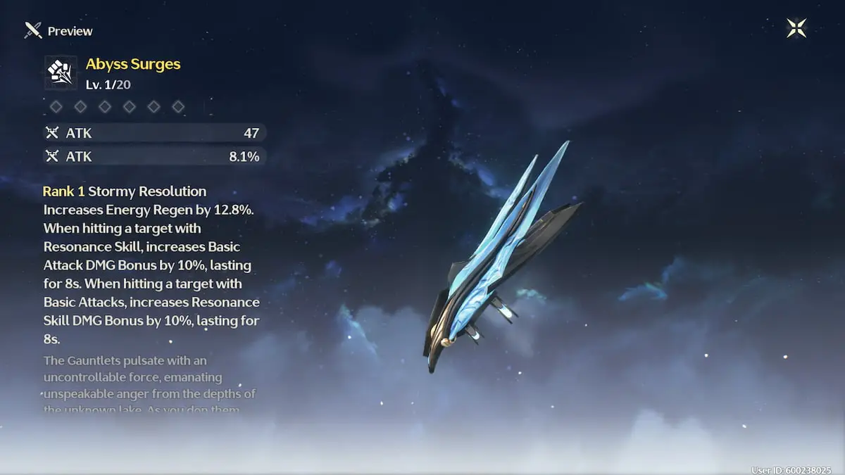 Abyss Surges - это единственная пятизвездочная рукавица в Wuthering Waves. Он увеличивает ATK и регенерацию энергии, что очень полезно для Jianxin. Оружие Pioneer Podcast, Stonard, также очень сильно, так как это единственная рукавица в игре с критом. Показатель крита.