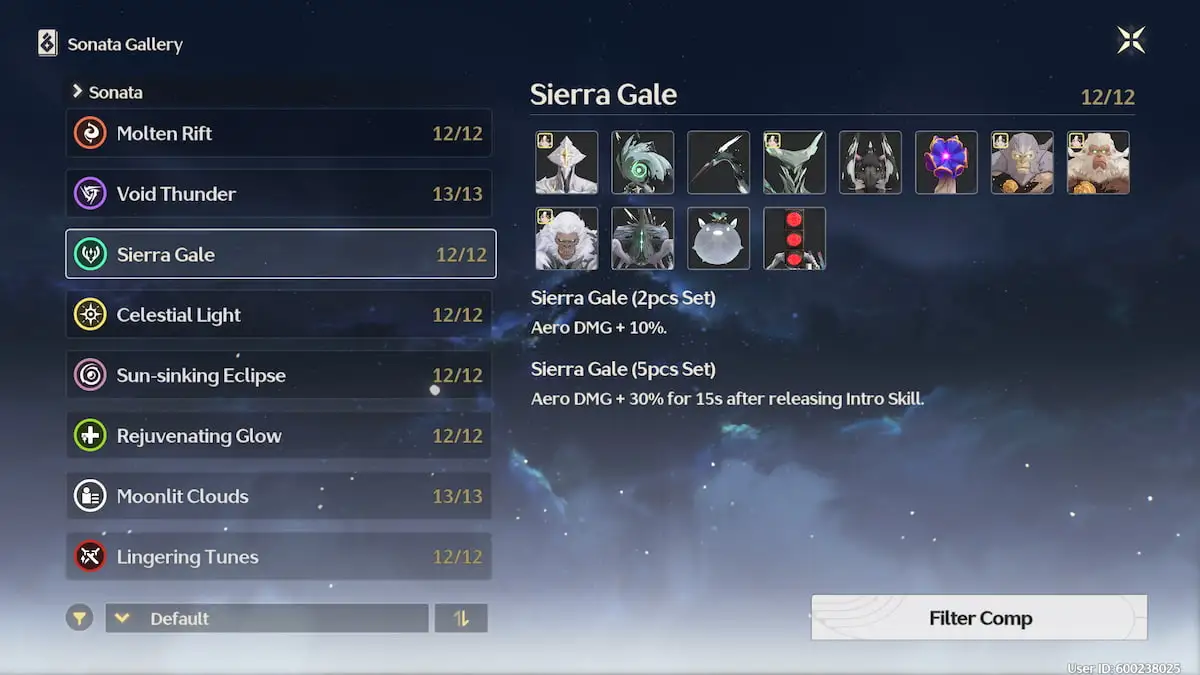 Для общего билда с нанесением урона лучшим набором «Эхо» является «Сьерра Гейл», увеличивающий Aero DMG. В качестве альтернативы вы можете выбрать набор Moonlit Clouds, который дает регенерацию энергии и увеличивает ATK следующего Резонатора после использования умения Outro. Этот вариант отлично подходит, если вы хотите склониться к более поддерживающему стилю игры, который хорошо сочетается с умением Jianxin «Outro», повышающим DMG следующего персонажа «Резонансное освобождение».
