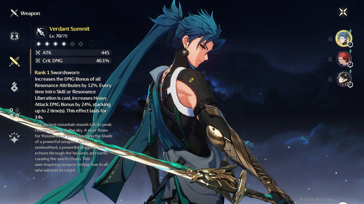 Verdant Summit - фирменное оружие Джияна и, очевидно, лучшее в его слоте. У него высокая базовая атака, он наносит много крит-урона, а его пассивка увеличивает урон всех атрибутов и тяжелых атак. Еще один отличный вариант - Lustrous Razor. Это пятизвездочное оружие, которое можно получить бесплатно, как только вы достигнете 45 уровня союза. Хотя оно не так хорошо, как фирменное, Lustrous Razor дает тонну процентов атаки, а это именно то, что нужно Джияну.