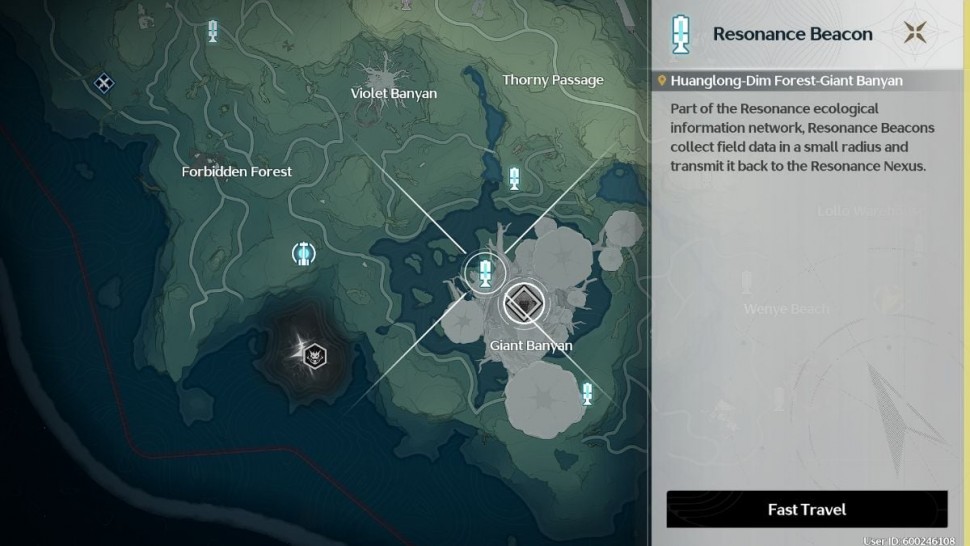 Ближайший резонансный маяк, который можно использовать для быстрого перемещения туда, - это маяк Huanglong-DimForest-Giant Banyan, расположенный к северо-западу от места боя с боссом. Если вы еще не разблокировали эту область карты, исследуйте юго-западный угол карты. Как только вы доберетесь до маяка резонанса, ниже описано, как найти арену босса Feilian Beringal: