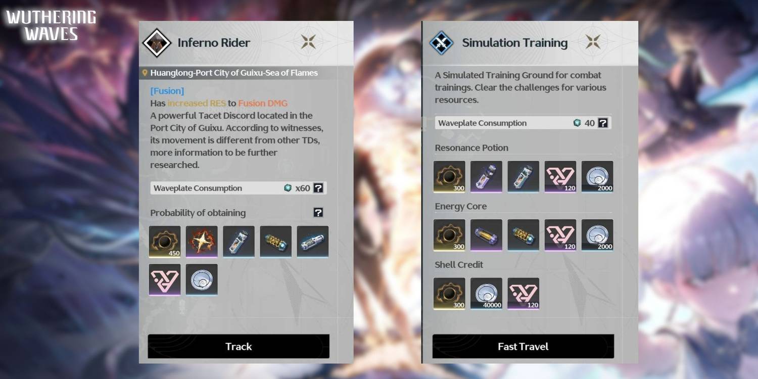 Тренировка симуляции - еще один способ получения ценных ресурсов, доступ к которому относительно проще. Он находится в городе Цзиньчжоу, отмечен специальным NPC и иконкой, куда игроки могут сразу же быстро переместиться. В тренировочной симуляции игроки могут выбирать между симуляциями для получения зелья резонанса (EXP персонажа), энергетического ядра (EXP оружия) или Shell Credits (внутриигровая валюта), чтобы получить дополнительное количество этих предметов. Каждое симуляционное обучение стоит 40 волнобоев, что позволяет игрокам проходить его 6 раз в день.