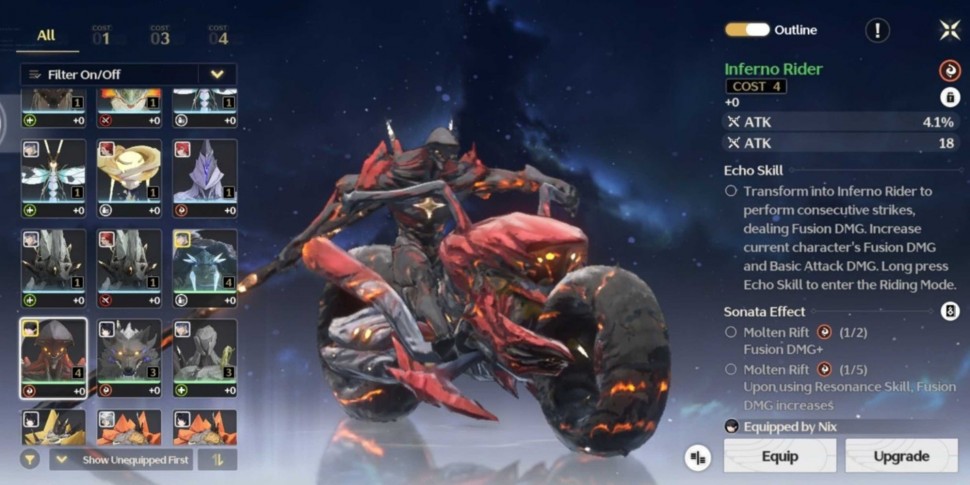 Для Чиксии идеальна схема 4-3-3-1-1 эхо, в которой впереди стоит эхо с 4 стоимостью урона от слияния, например Всадник Инферно, чтобы максимизировать ее производительность. Использование пяти фьюжн-эхо в команде также эффективно, так как оно разблокирует бонус сета Molten Rift Sonata Effect, который увеличивает DMG резонансных умений Чиксии на 30% на 15 секунд.