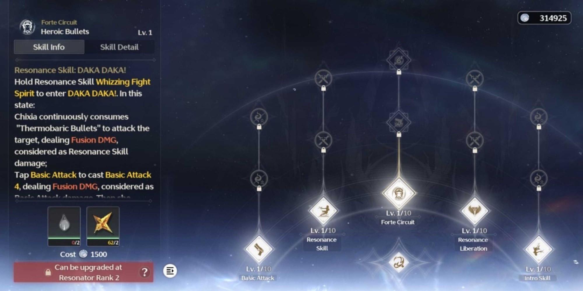 Форте Чиксии имеет решающее значение в бою, так как она является резонатором, работающим на основе умений. Чтобы максимизировать урон от слияния, игрокам следует отдавать предпочтение базовым умениям, затем форте и резонансным умениям. Здесь представлены лучшие приоритеты форте для Чиксии: