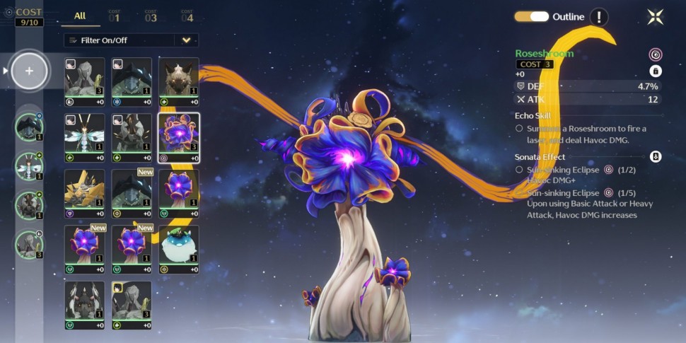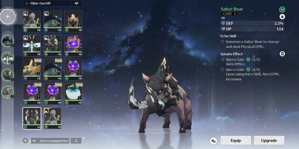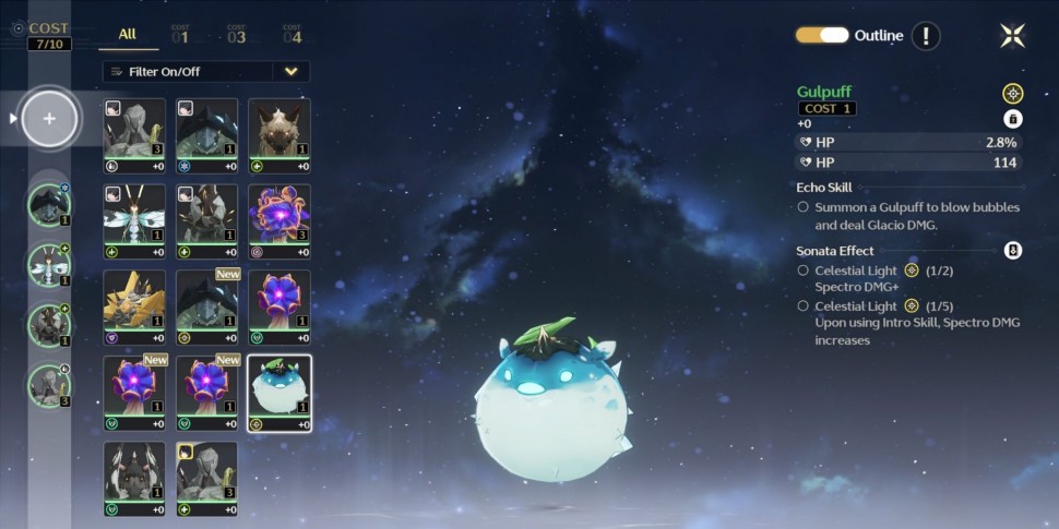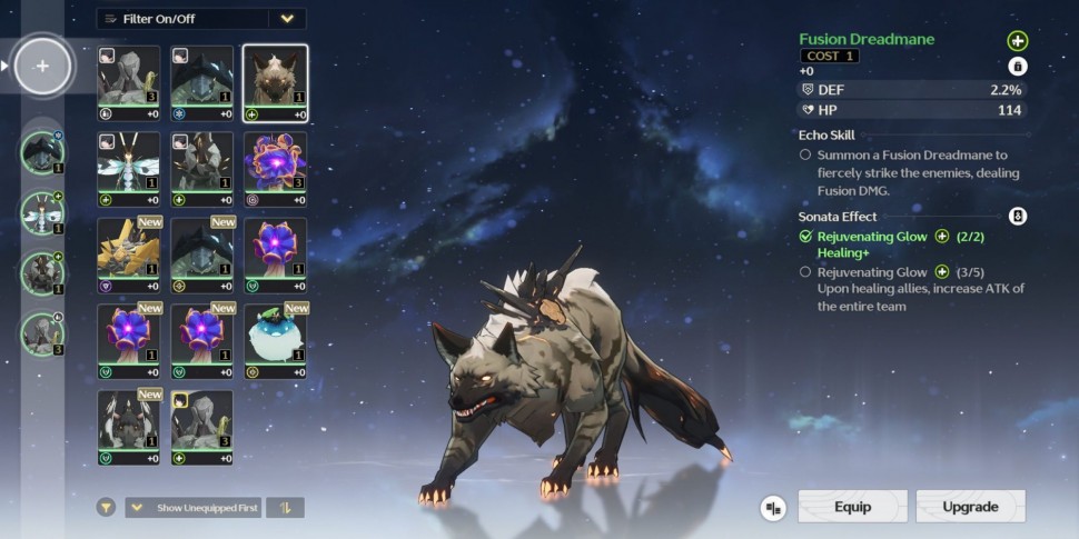 Эхо может стоить 1, 2 или 3 цены. Когда дело доходит до экипировки Эхо для Резонатора, каждый Резонатор может иметь до пяти различных Эхо одновременно, в зависимости от общей стоимости, имеющейся у персонажа. Первый слот для Эхо - это место, где будет находиться ваше основное Эхо, дающее баффы к вашим статам, а также уникальное умение, которое можно использовать в бою наряду с другими приемами. В остальные четыре слота вы можете поместить дополнительные эхо, которые дадут вам полезные прибавки к статам, но не добавят уникального умения, как основное эхо.