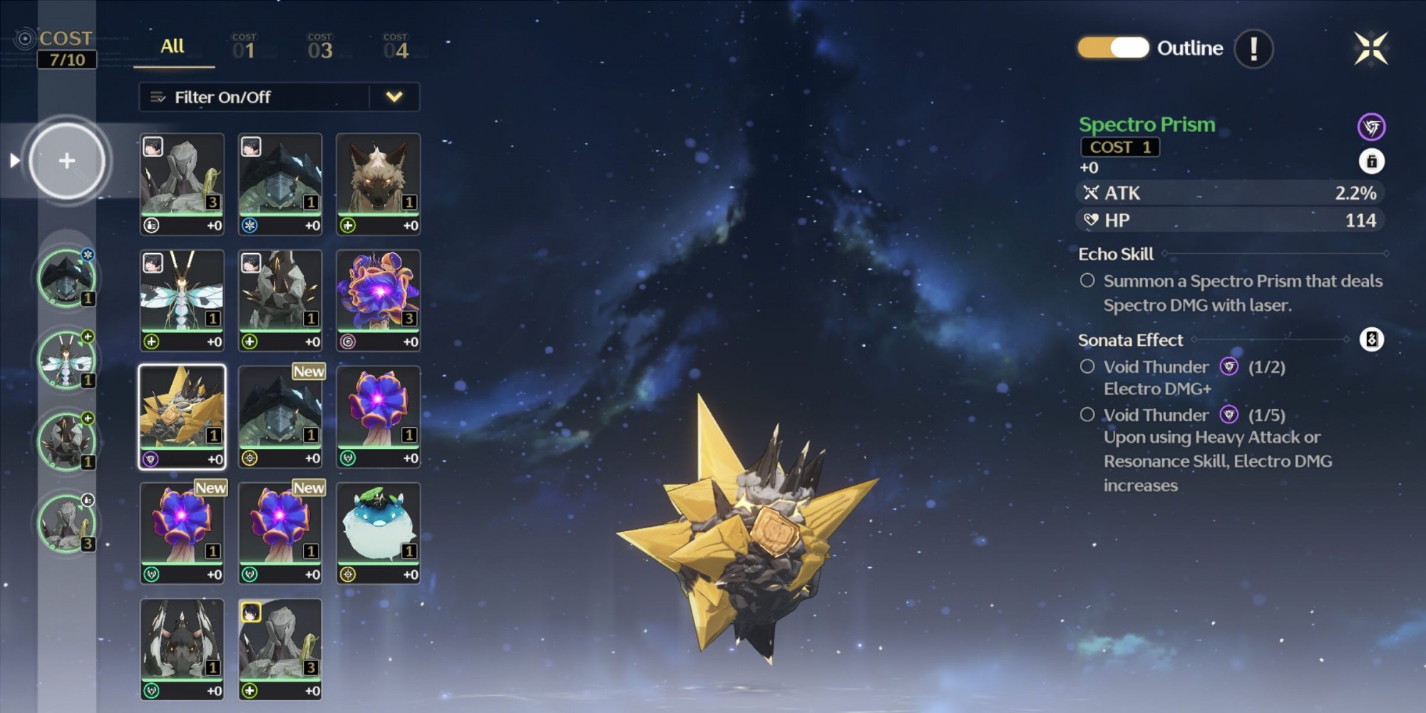 Эхо может стоить 1, 2 или 3 цены. Когда дело доходит до экипировки Эхо для Резонатора, каждый Резонатор может иметь до пяти различных Эхо одновременно, в зависимости от общей стоимости, имеющейся у персонажа. Первый слот для Эхо - это место, где будет находиться ваше основное Эхо, дающее баффы к вашим статам, а также уникальное умение, которое можно использовать в бою наряду с другими приемами. В остальные четыре слота вы можете поместить дополнительные эхо, которые дадут вам полезные прибавки к статам, но не добавят уникального умения, как основное эхо.