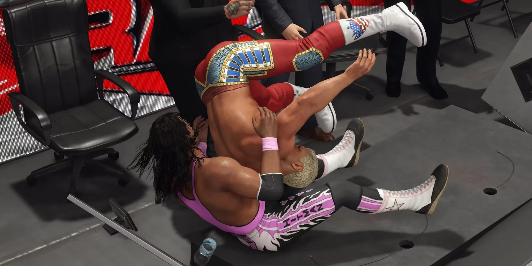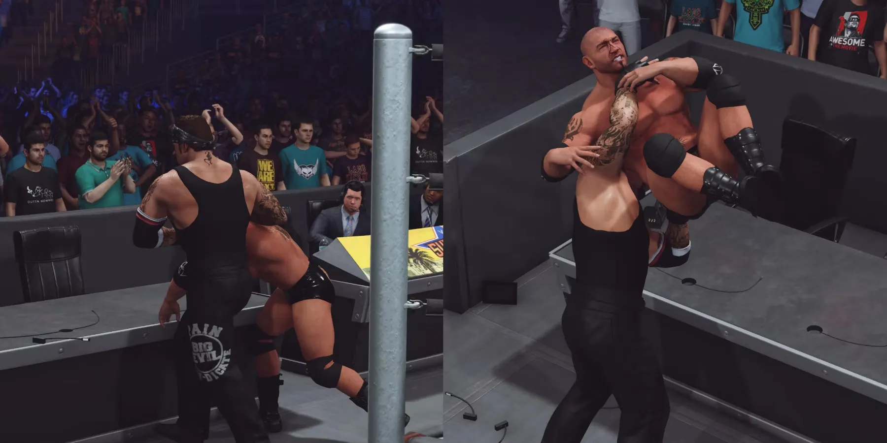 WWE 2K23 позволяет игрокам воссоздать классические моменты из матчей WWE. Это включает в себя экстремальные приемы, такие как удар рестлера через стол комментатора. Любители зрелищных атак, подобных этой, могут пробить своих противников через стол. Удар через стол комментатора выполняется как завершающий прием.