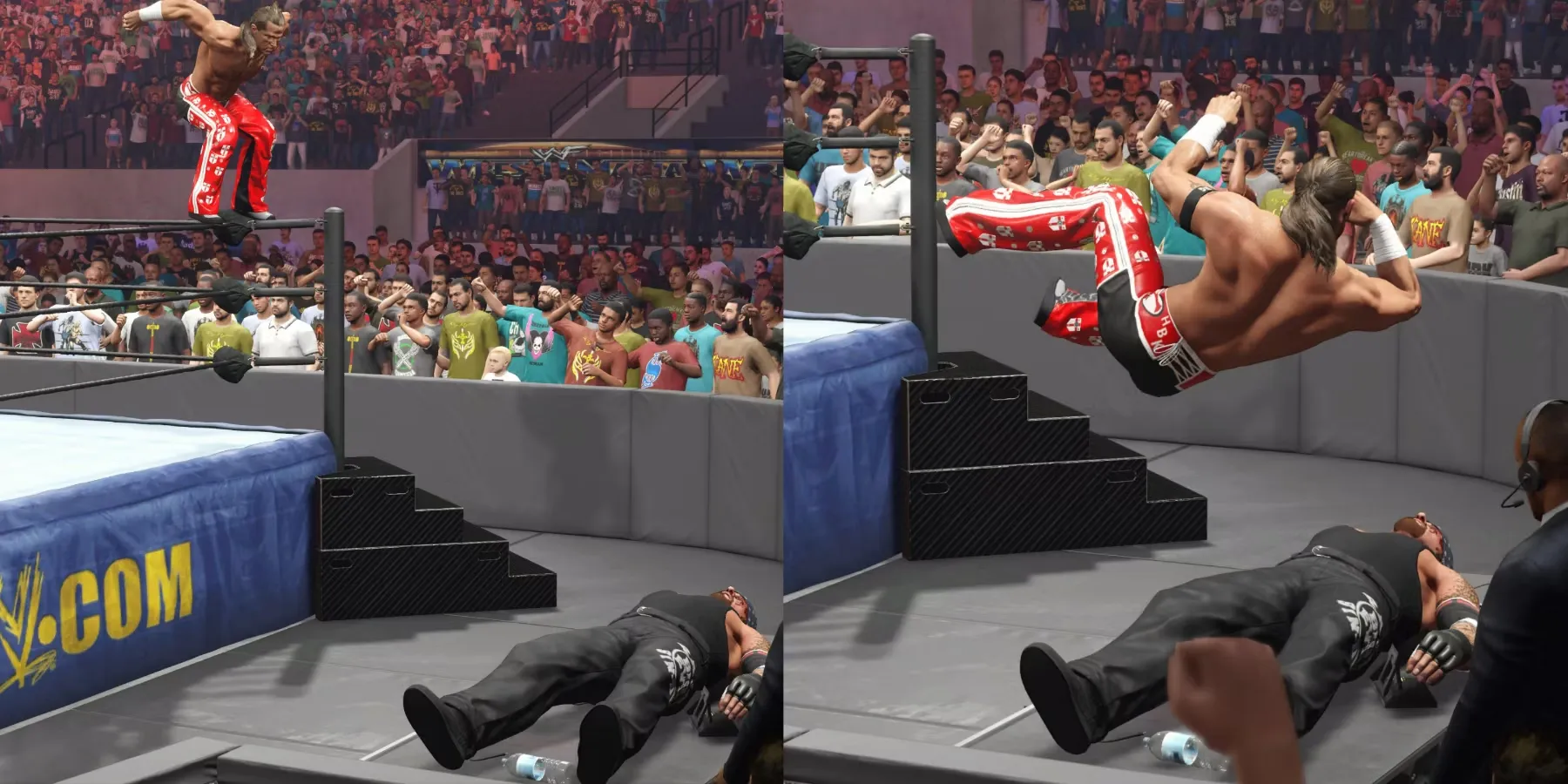 Этот прием наносит больше урона и является отличным способом заставить соперника уйти в минус во время матча WWE 2K23. К сожалению, добивающие приемы предустановлены, и игроки не могут уложить соперника на стол комментатора, чтобы выполнить летящие атаки через стол, если только он не установлен в разделе "Другие" в разделе "Добивающие приемы" вместе с такими приемами, как Diving Elbow Drop 5, который назначен Шону Майклзу.