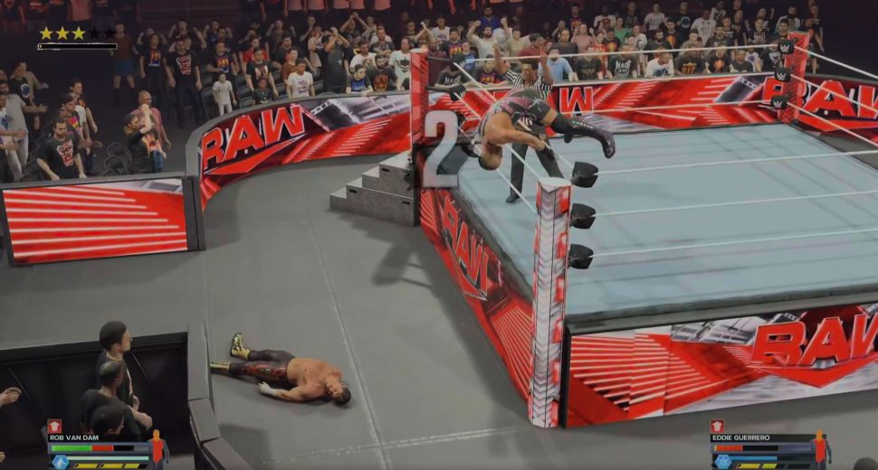- Бегущий трамплин наружу: когда суперзвезда WWE находится снаружи, удерживайте кнопку L2/LT + стик R по направлению к канатам, чтобы бежать, и L1+Square или X. Или LB+X или A немного раньше, чем рестлер ударится о канаты или угол, чтобы перепрыгнуть через них.