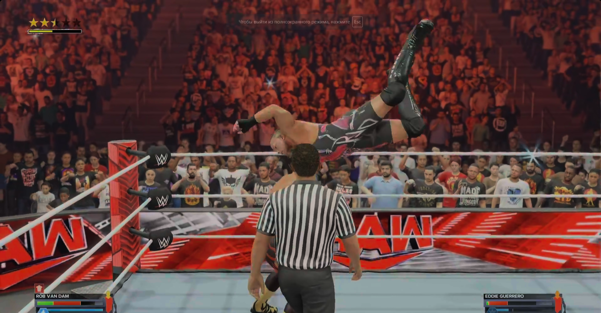 - Бегущий трамплин наружу: когда суперзвезда WWE находится снаружи, удерживайте кнопку L2/LT + стик R по направлению к канатам, чтобы бежать, и L1+Square или X. Или LB+X или A немного раньше, чем рестлер ударится о канаты или угол, чтобы перепрыгнуть через них.