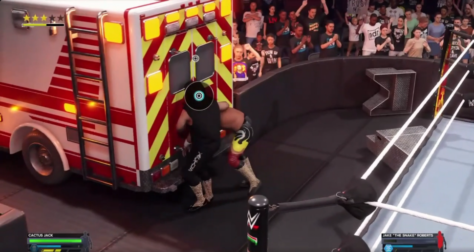- Чтобы усадить противника в машину скорой помощи, сначала нужно выйти с ним за пределы ринга и открыть двери машины скорой помощи. Вы можете открыть двери грузовика, подойдя к ним и нажав кнопку L1/LT.