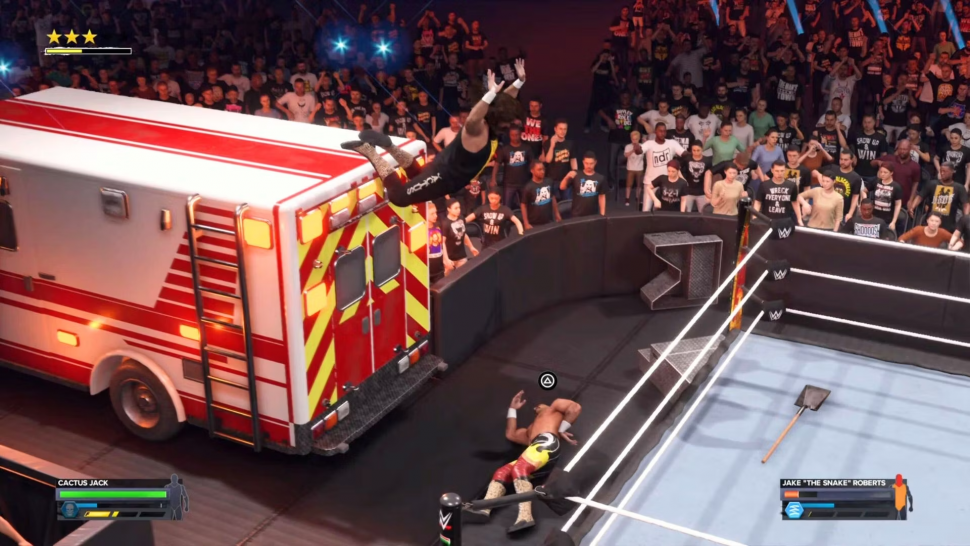 Самая захватывающая особенность матча на машинах скорой помощи в WWE 2K24 - возможность забраться на самый верх грузовика и даже выполнить движения, которые отправят вас или вашего соперника на землю. Если вы и ваш соперник окажетесь на вершине машины скорой помощи, у вас появится возможность не только сбросить их с машины, но и провести рискованную атаку с нырком, не опасаясь стать жертвой финишера, чтобы нанести еще большее наказание.