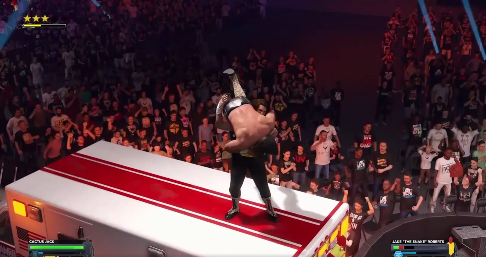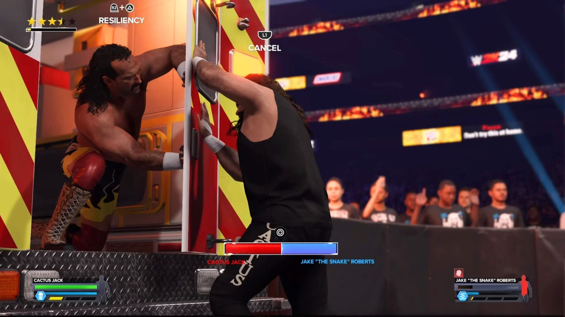 Самая захватывающая особенность матча на машинах скорой помощи в WWE 2K24 - возможность забраться на самый верх грузовика и даже выполнить движения, которые отправят вас или вашего соперника на землю. Если вы и ваш соперник окажетесь на вершине машины скорой помощи, у вас появится возможность не только сбросить их с машины, но и провести рискованную атаку с нырком, не опасаясь стать жертвой финишера, чтобы нанести еще большее наказание.