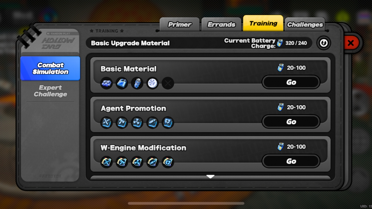 Чтобы повысить уровень W-Engines, вам понадобятся блоки питания W-Engine, батареи W-Engine или энергетические модули W-Engine. Их можно получить, выполнив материал "Базовые обновления" в симуляторе боя. Убедитесь, что вы выбрали правильный тест, то есть тот, который дает нужные компоненты, такие как атака, оглушение, аномалия, поддержка или защита.